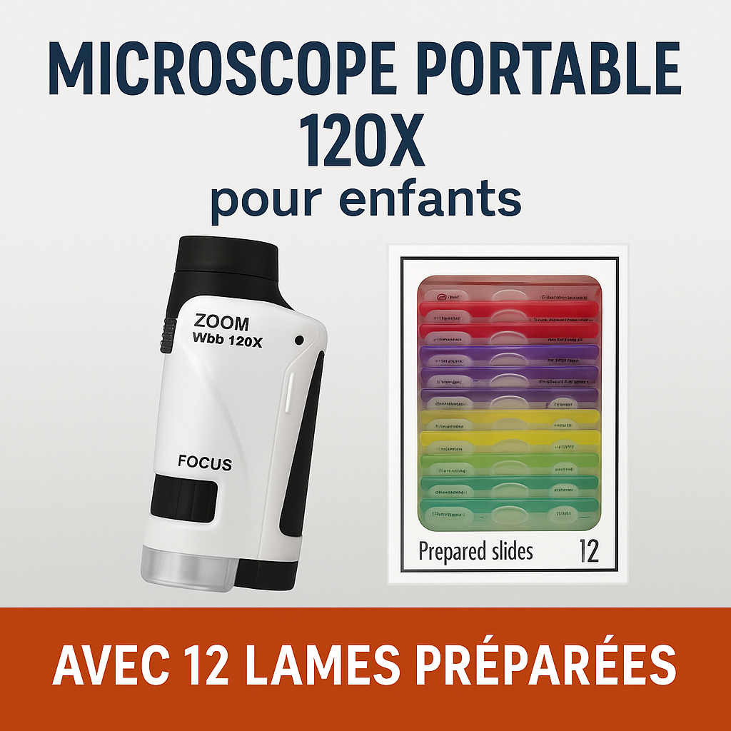 Microscope Portable 120X pour Enfants + 12 Lames Préparées – Loupe Scientifique Éducative
